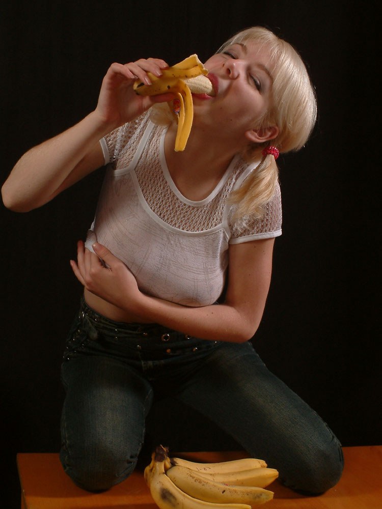 Euro Blonde In Pigtails Enjoys Banana